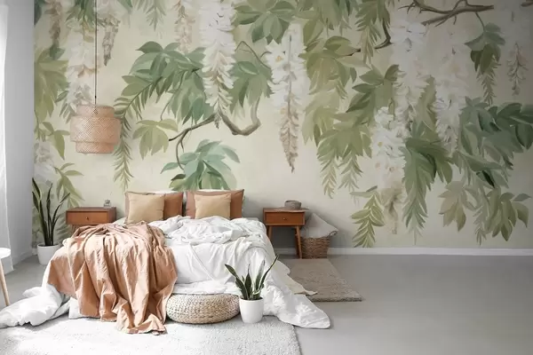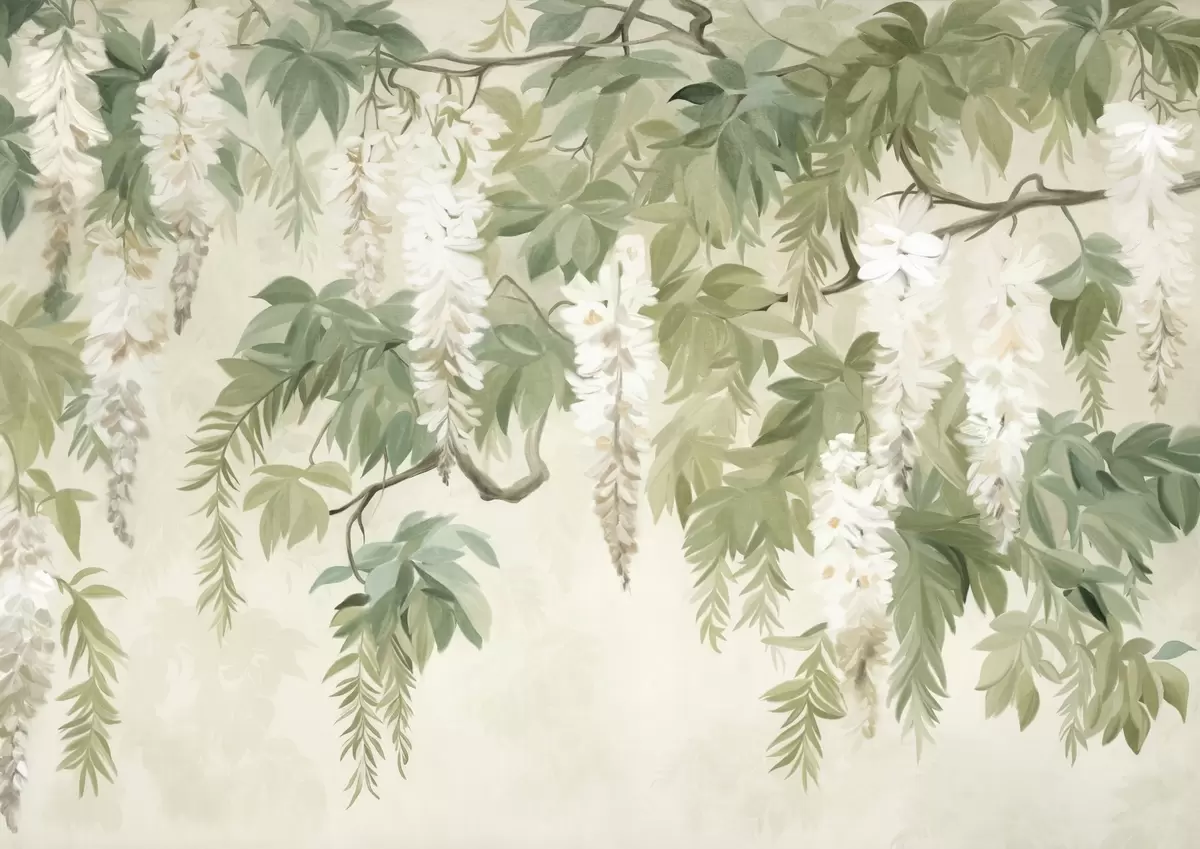 Fototapet Blåregn-grene med hvide blomster og grønne blade, grøn baggrund, tekstureret vintage-maleri Nr. w09375