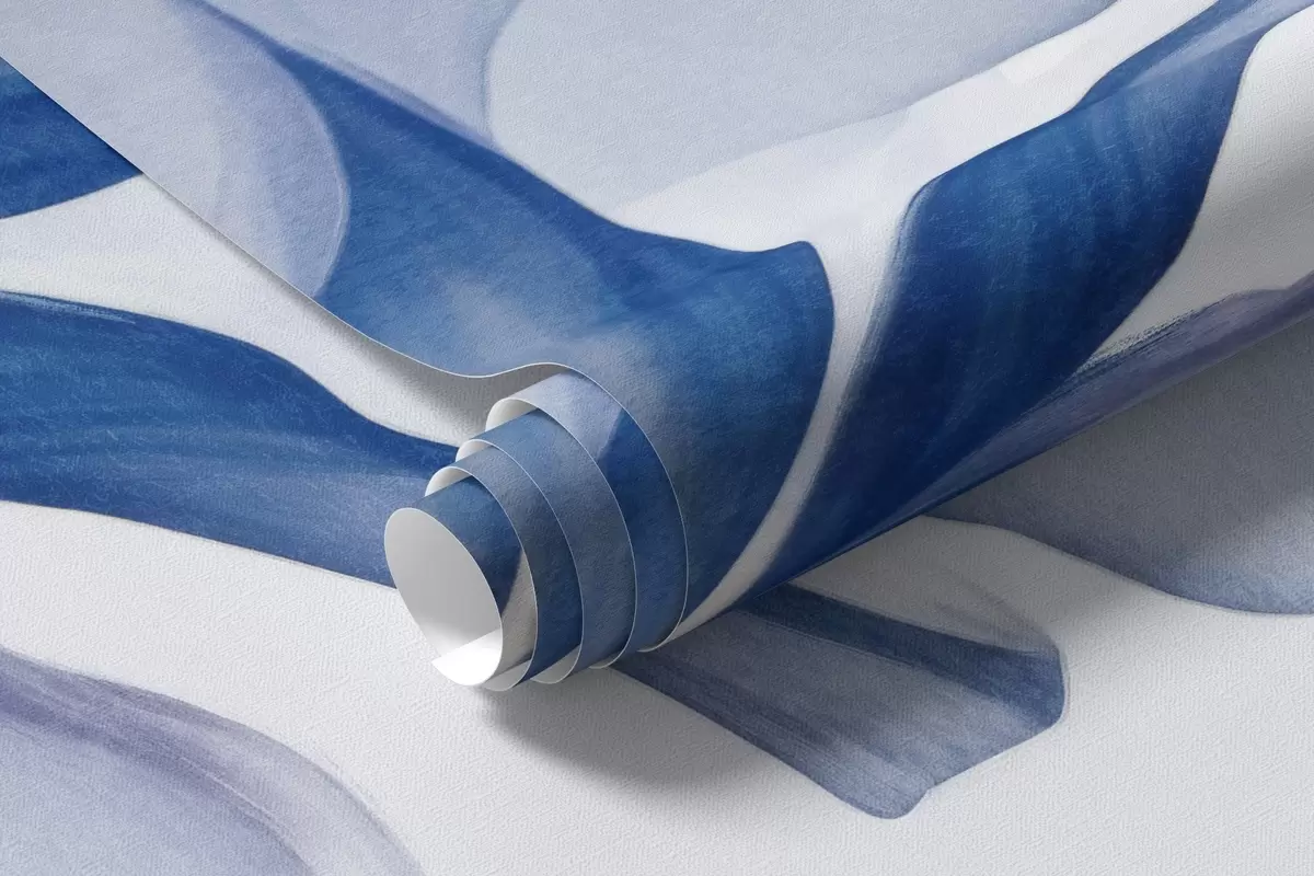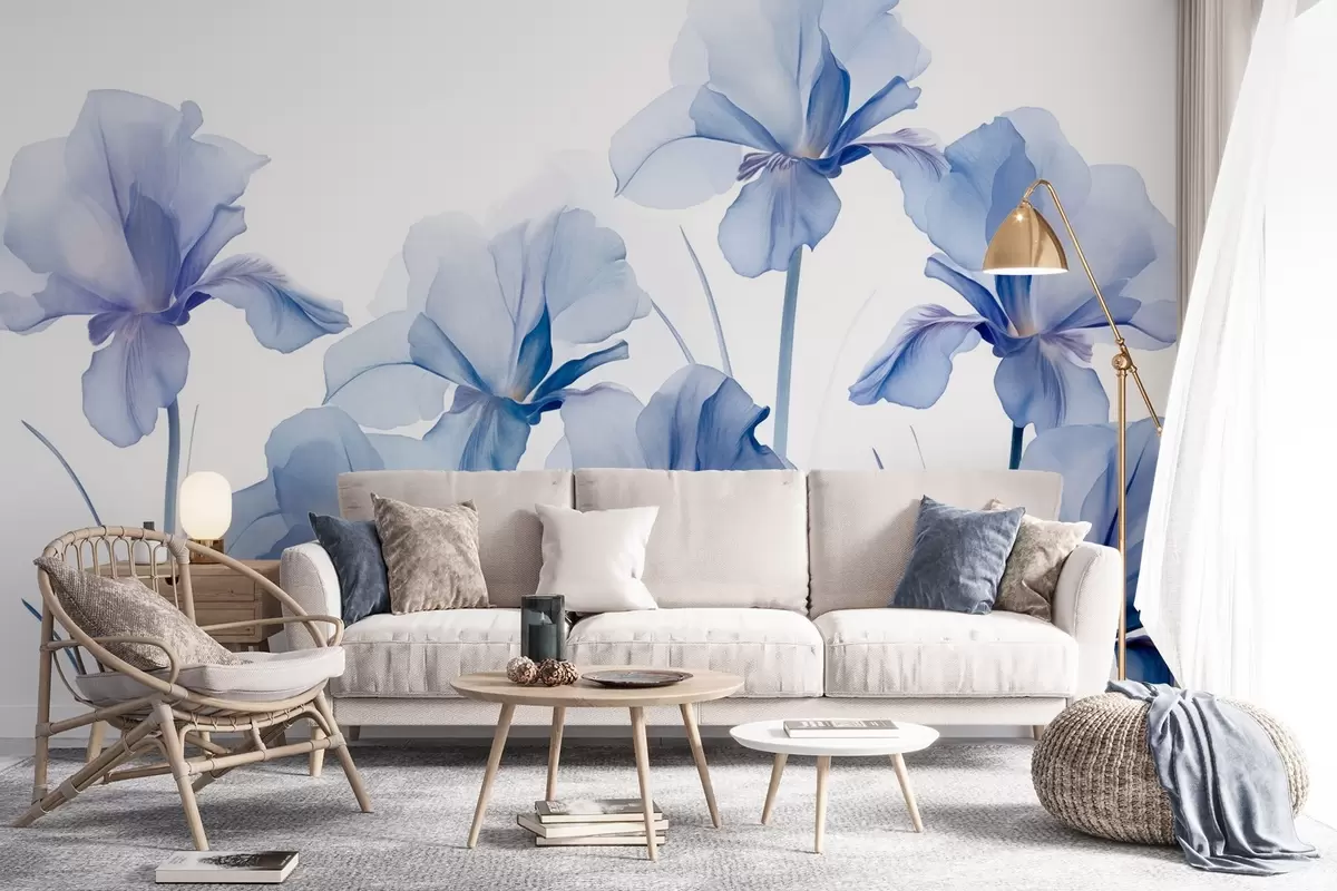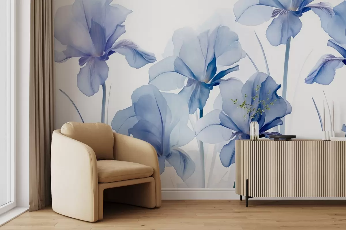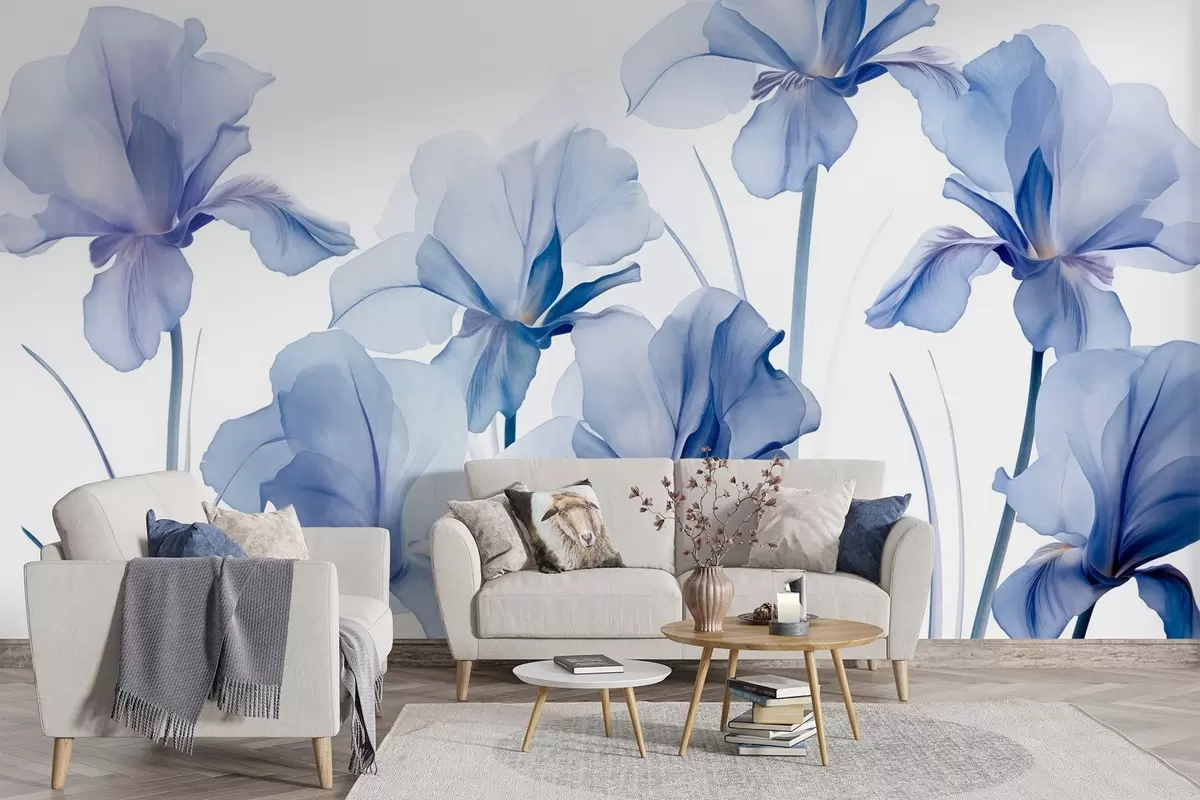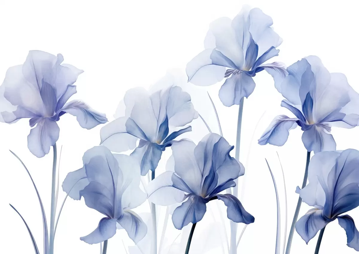Fototapet Blå irisblomster med gennemskinnelige kronblade og lange stilke, arrangeret i en række mod en blå baggrund, blød og struktureret Nr. w09379