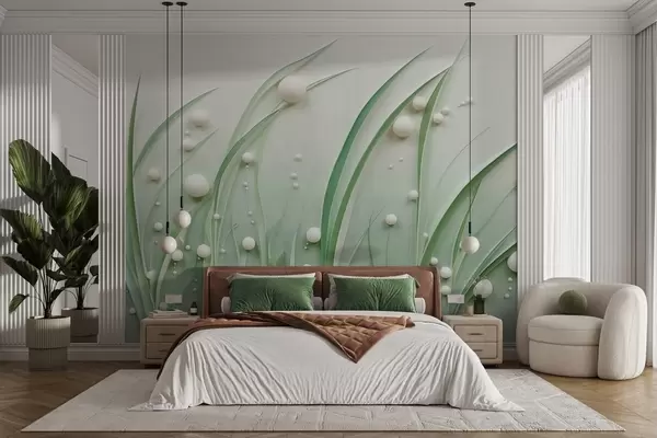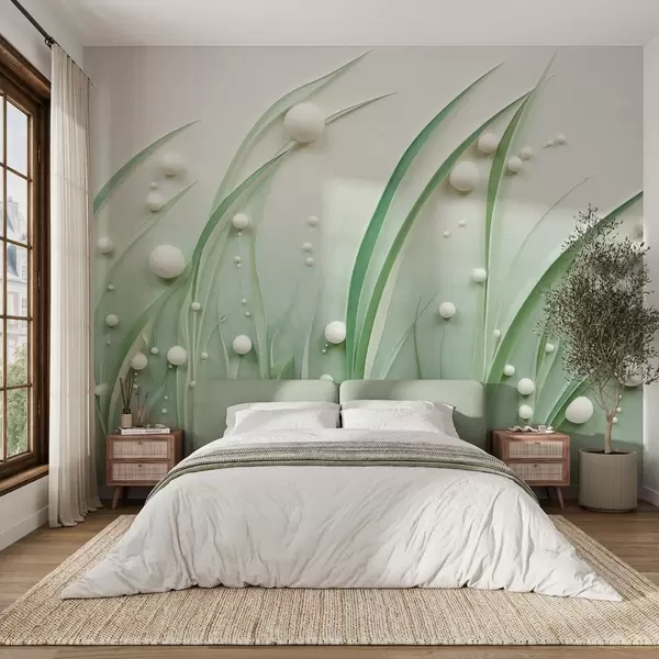 Fototapet Abstrakt grønt græs med hvide kugler, lysegrøn baggrund, struktureret, rene linjer, minimalistisk stil Nr. w09382