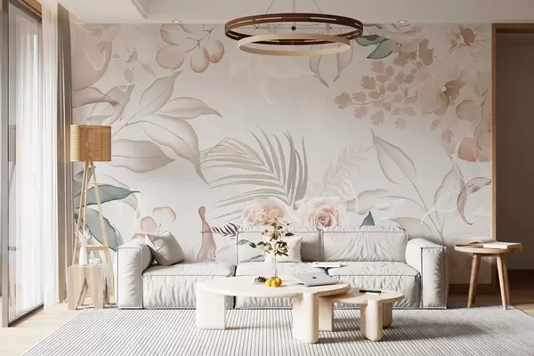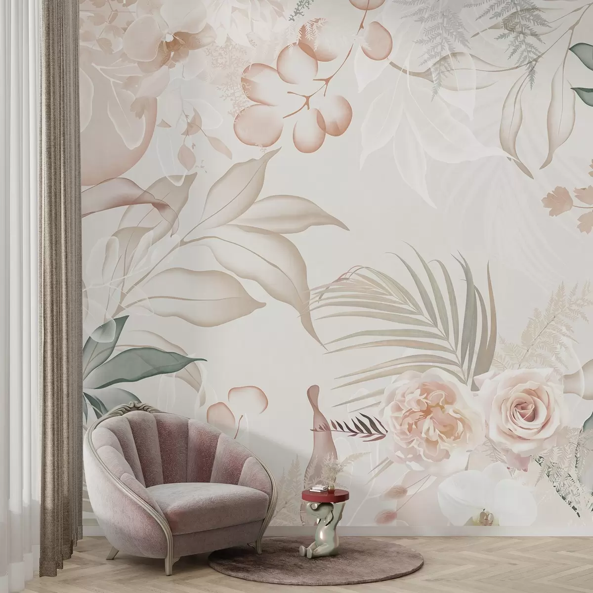 Fototapet Blomsterarrangement med roser, orkideer, eukalyptus og palmeblade i pastelfarver, beige baggrund Nr. w09393