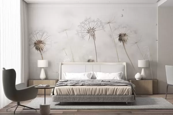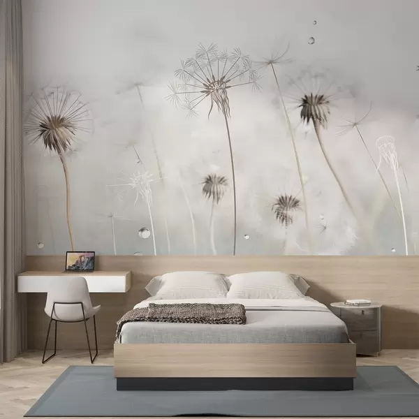 Fototapet Mælkebøtter med vanddråber, hvid baggrund, nærbillede, blødt lys, natur, botanisk, æterisk, delikat, minimalistisk Nr. w09399