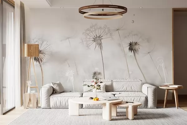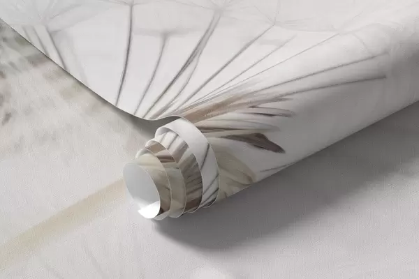 Fototapet Mælkebøtter med vanddråber, hvid baggrund, nærbillede, blødt lys, natur, botanisk, æterisk, delikat, minimalistisk Nr. w09399