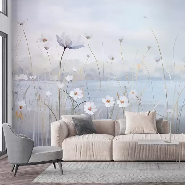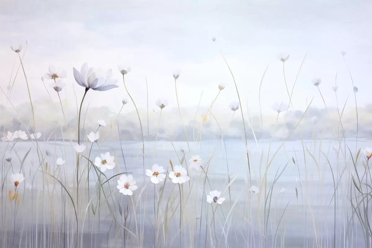 Fototapet Hvide blomster med lange stængler i en mark, lyseblå himmel, bløde farver, struktureret, minimalistisk stil, naturinspireret, rolig baggrund Nr. w09401