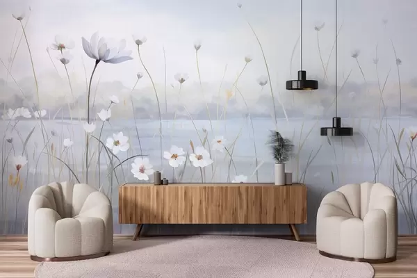 fototapeter Hvide blomster med lange stængler i en mark, lyseblå himmel, bløde farver, struktureret, minimalistisk stil, naturinspireret, rolig baggrund w09401