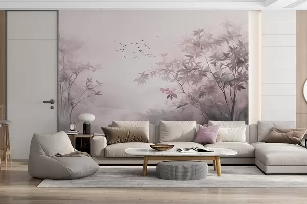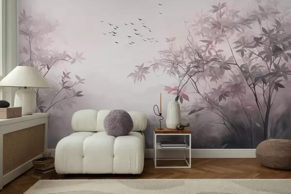 Fototapet Tekstureret landskab med træer og en flok fugle, der flyver på himlen, pastelfarver, naturbillede Nr. w09418v1