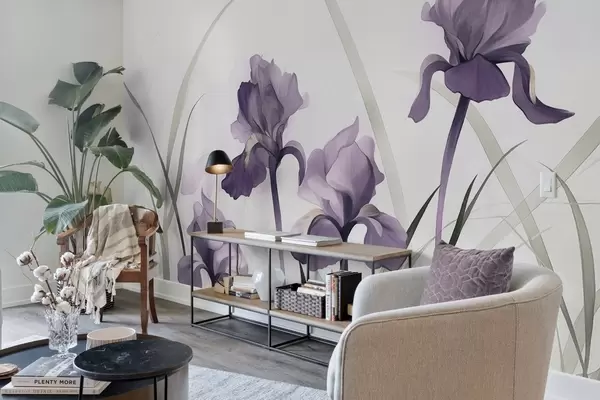 Fototapet Lilla irisblomster med grønne stængler, akvarelmaleri-stil, hvid baggrund, bløde farver, elegant, kunstnerisk Nr. w09425