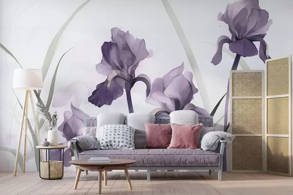 Fototapet Lilla irisblomster med grønne stængler, akvarelmaleri-stil, hvid baggrund, bløde farver, elegant, kunstnerisk Nr. w09425