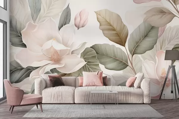 Fototapet Magnoliablomster med blade i pastelfarver, hvid, lyserød og grøn, bløde, delikate, akvarelstil Nr. w09427