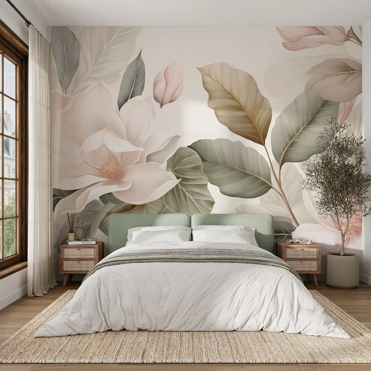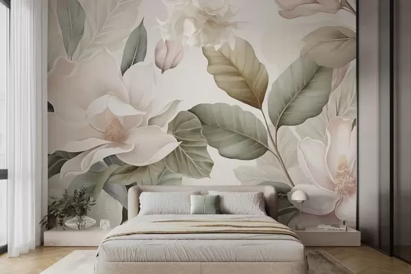 Fototapet Magnoliablomster med blade i pastelfarver, hvid, lyserød og grøn, bløde, delikate, akvarelstil Nr. w09427