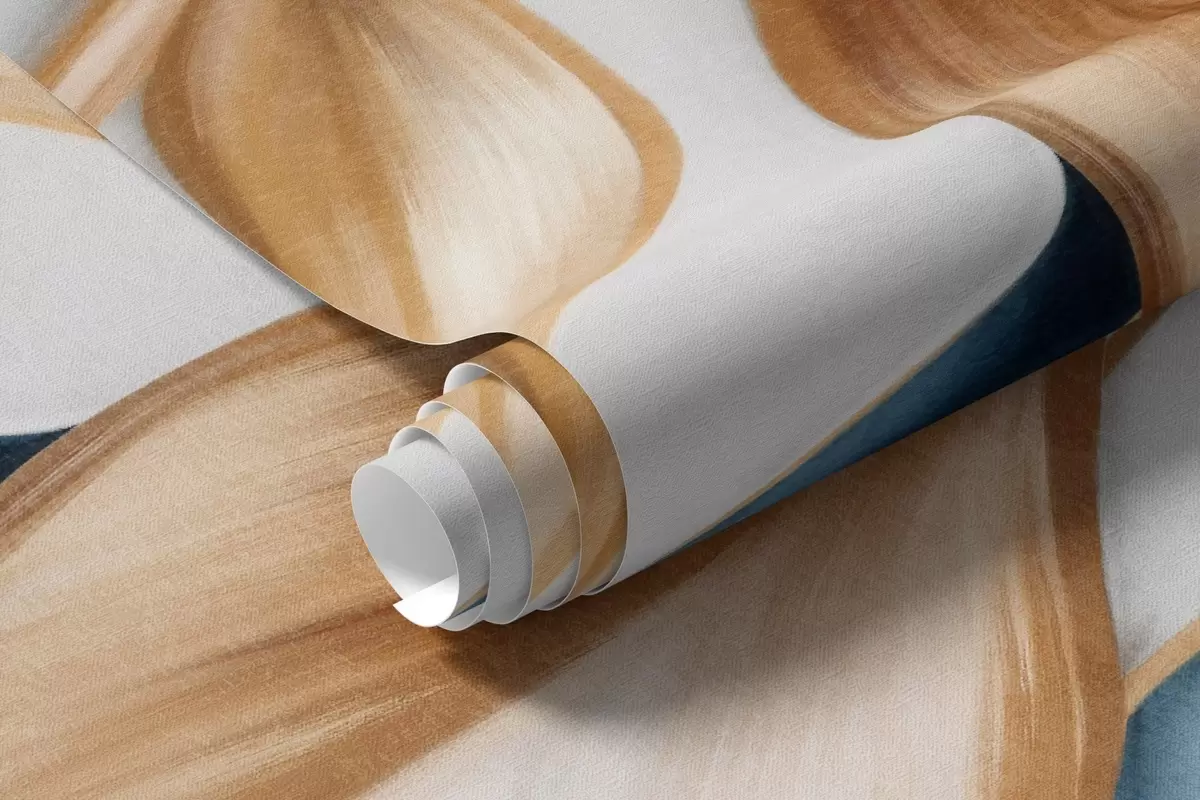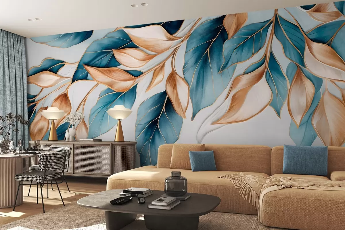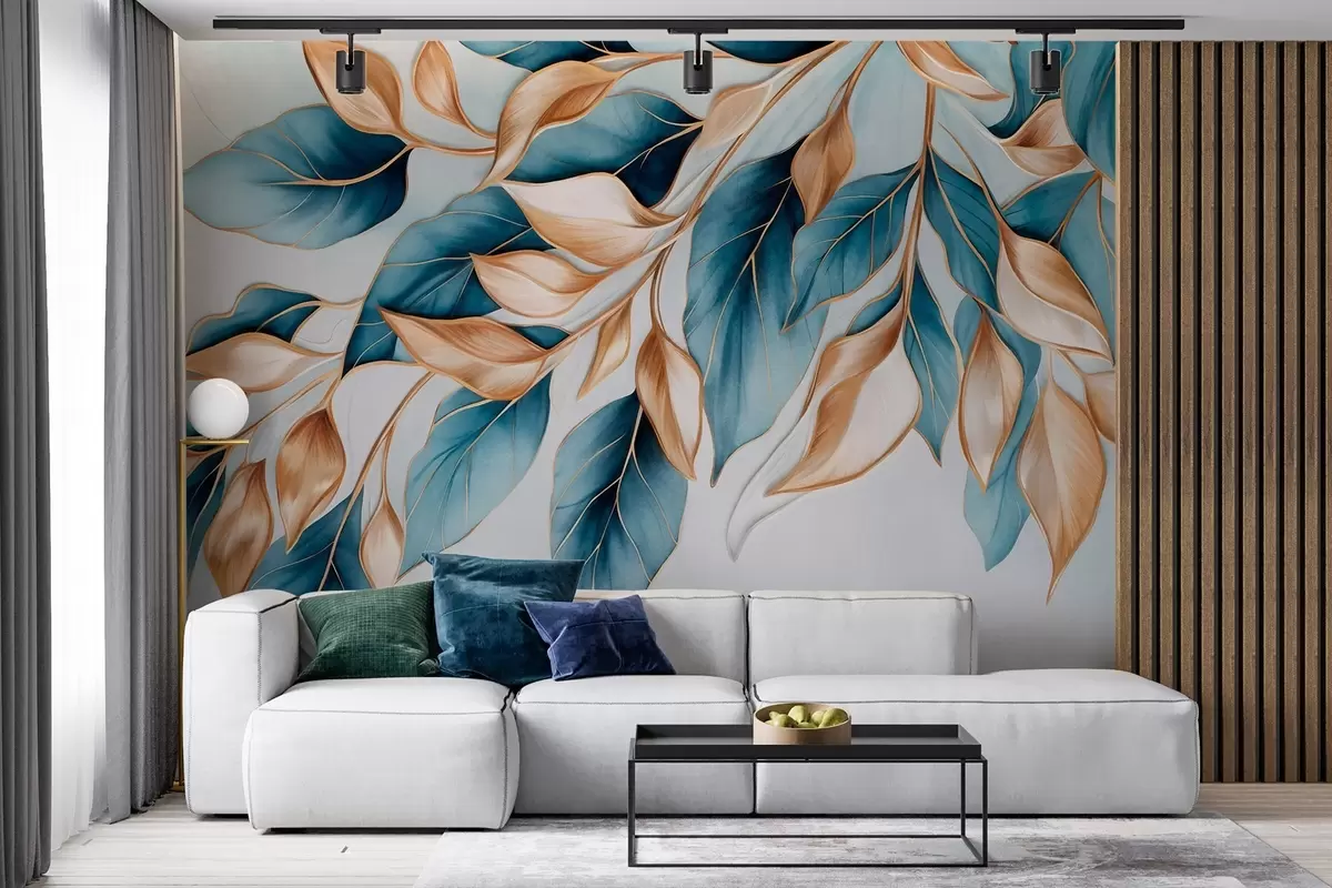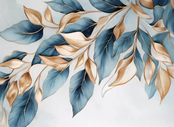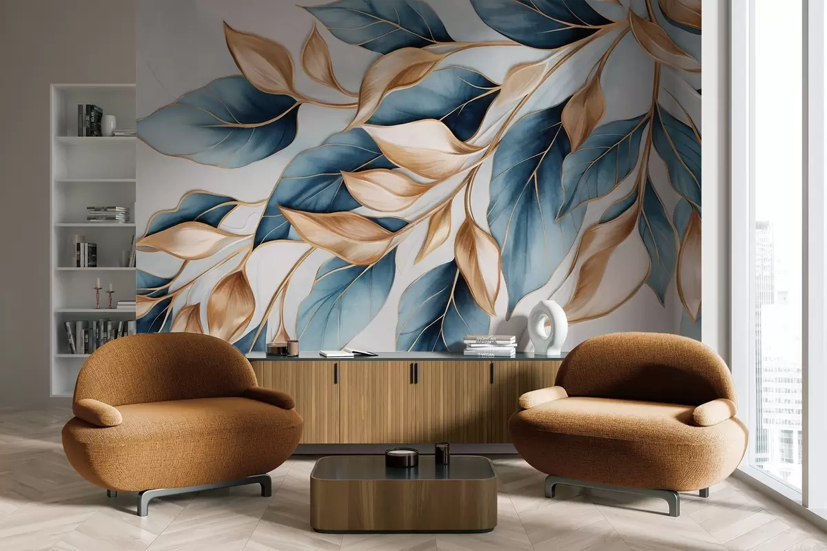 Fototapet Teksturerede blå og orange blade, lys blå baggrund, elegant og kunstnerisk design, moderne stil Nr. w09429