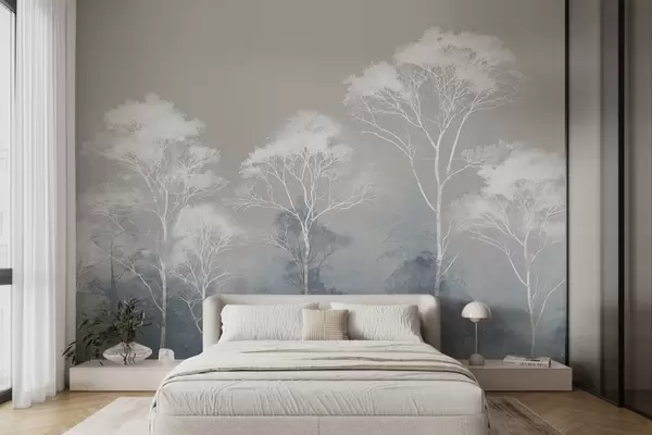 Fototapet Minimalistiske træer i blågrå farver, i tåge Nr. w09448