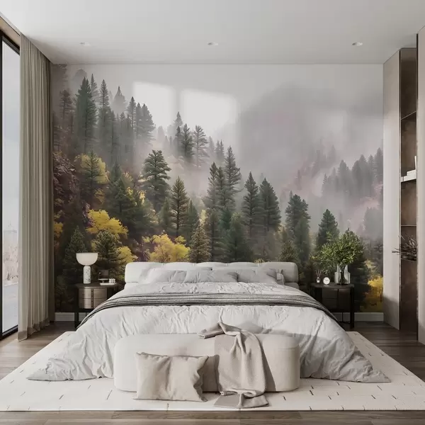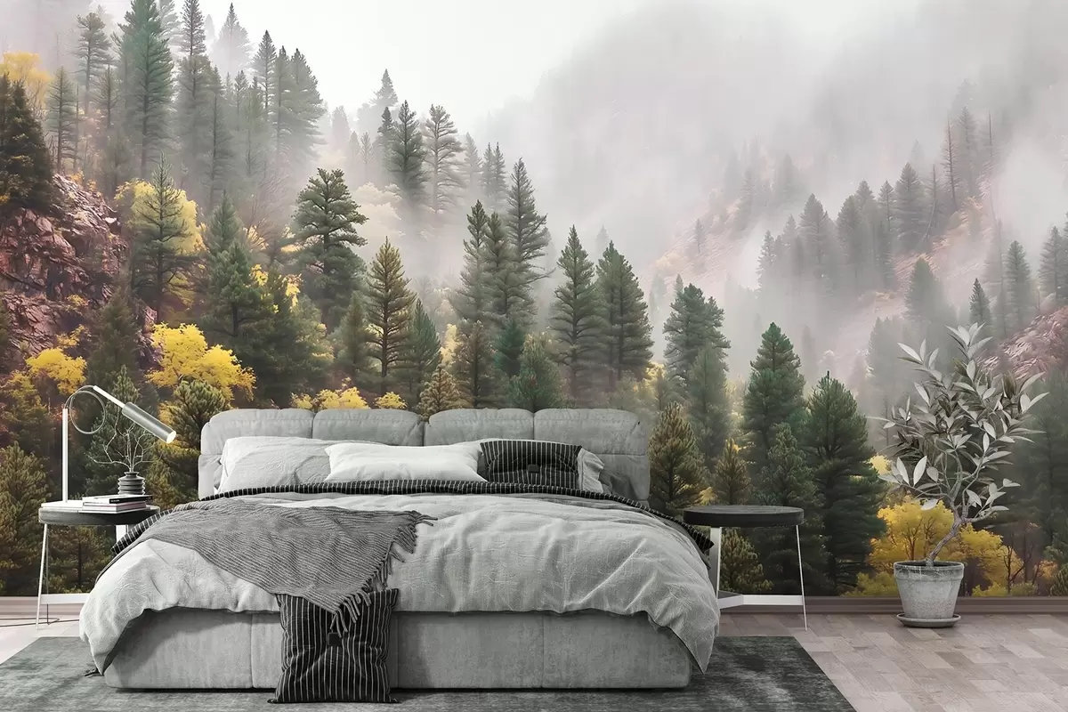 Fototapet Atmosfærisk tåget fyrreskov i bjergene Nr. w09463