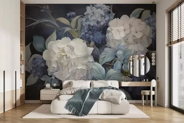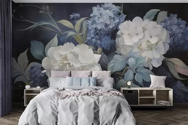 Fototapet Tekstureret mørkeblå maleriimitation af hortensiablomster med store blade, abstrakt og mørk baggrund Nr. w09465v1