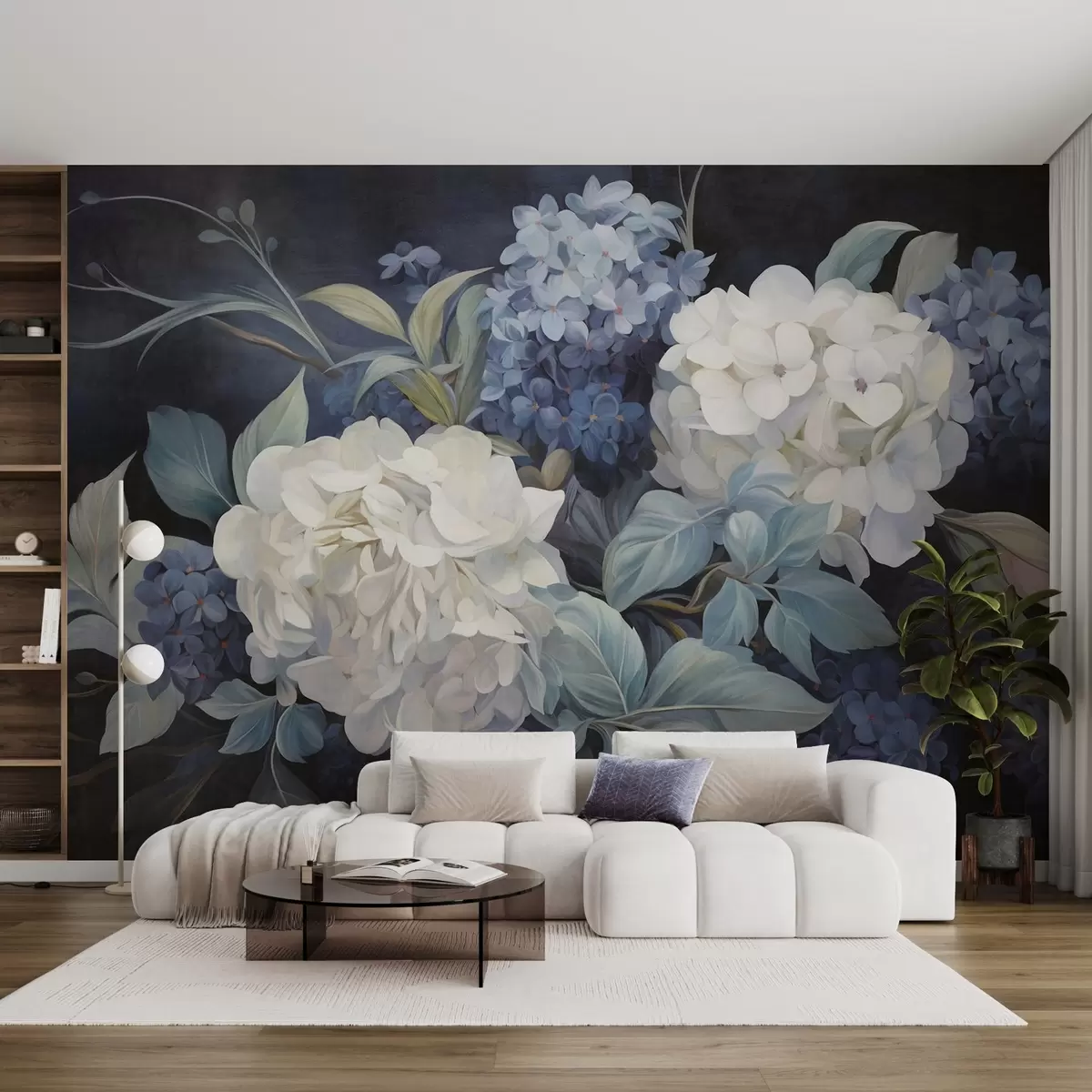 Fototapet Tekstureret mørkeblå maleriimitation af hortensiablomster med store blade, abstrakt og mørk baggrund Nr. w09465v1