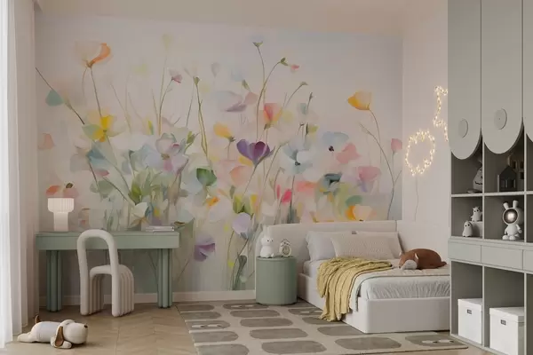 Fototapet Abstrakt felt med farverige blomster med lange stængler og grønne blade, struktureret, pastelfarver, lyse farver Nr. w09466