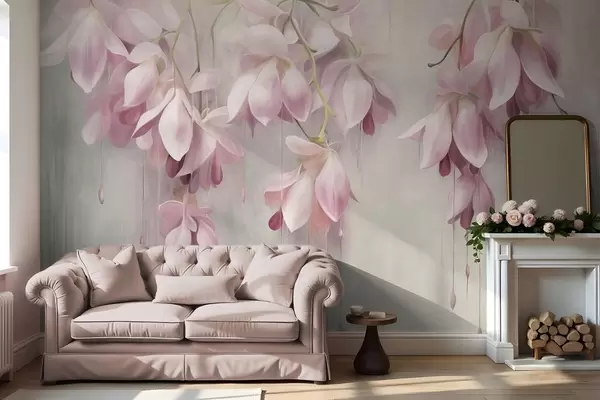 Fototapet Hængende lyserøde blomster, lysegrå baggrund, blomstertekstureret arrangement, botanisk kunst, pastelfarver Nr. w09471