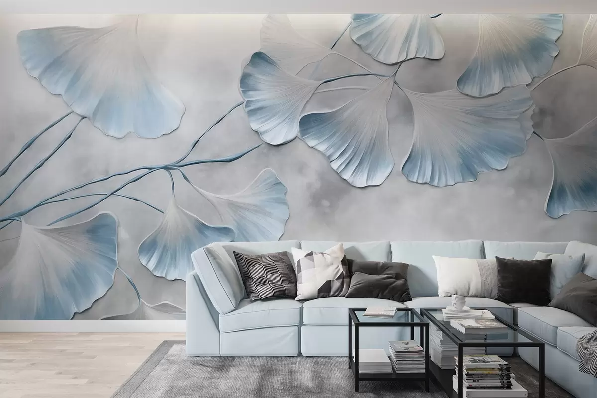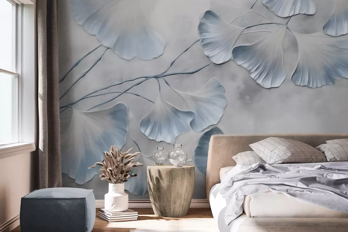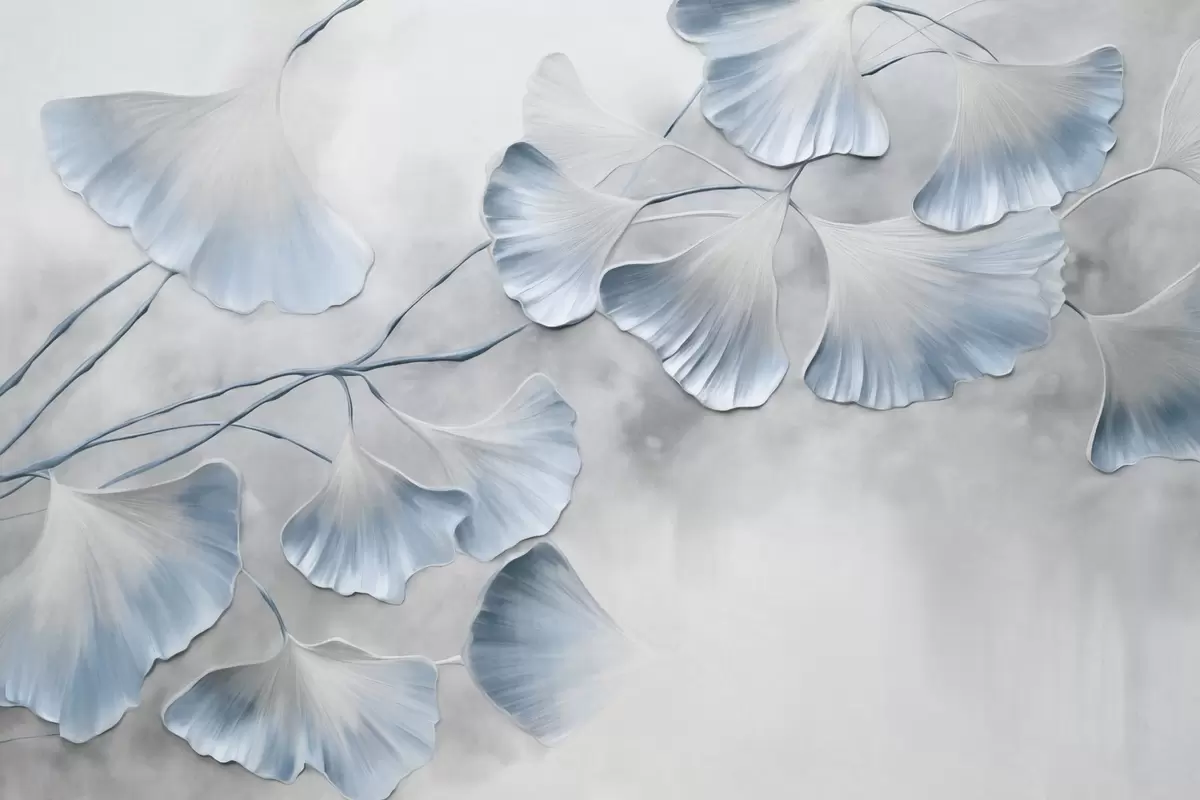 Fototapet Ginkgo biloba-blade med blå kanter på en gren, grå tekstureret baggrund, elegant og minimalistisk design Nr. w09472v1