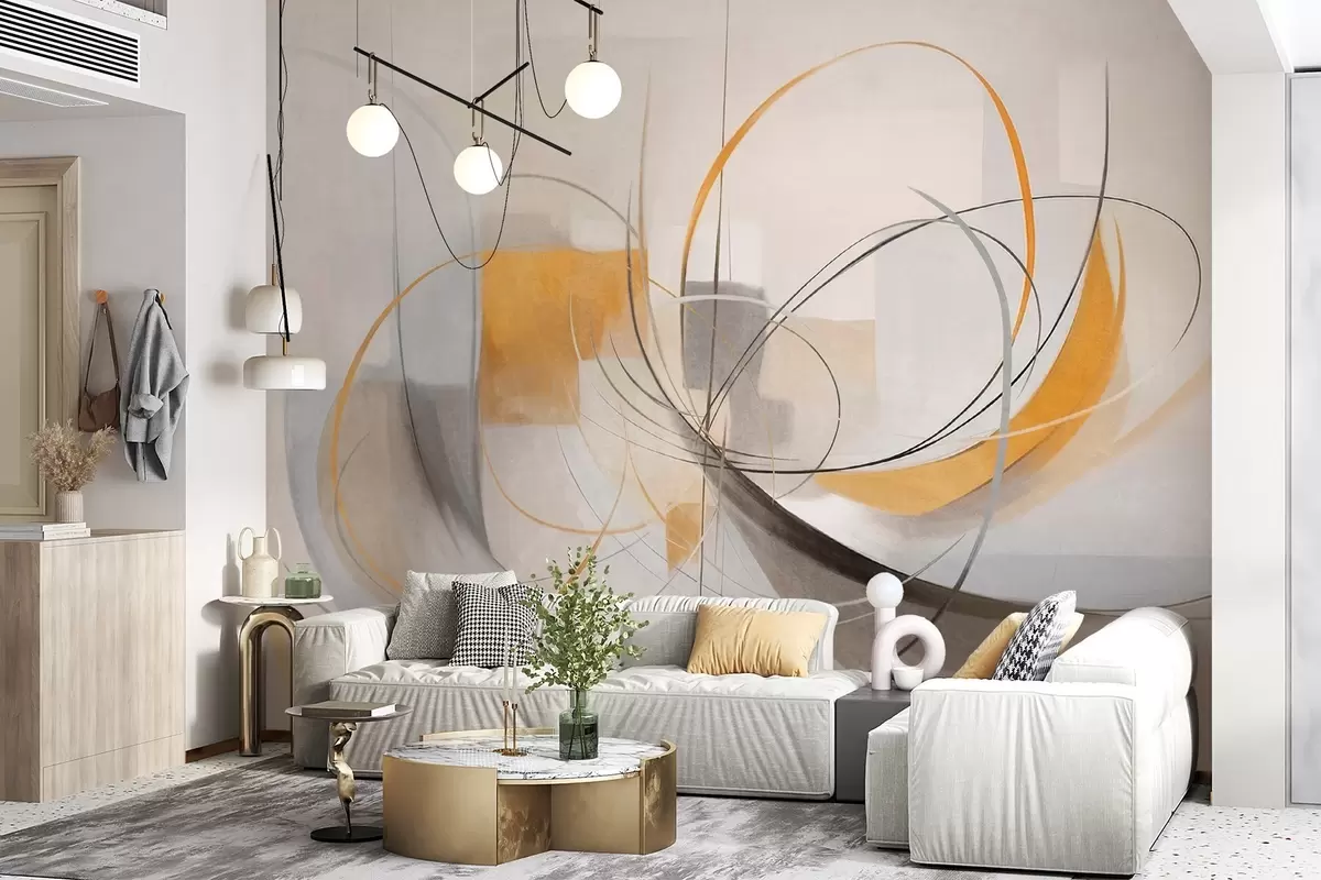 Fototapet Abstrakt tekstureret moderne malestil med buede linjer og geometriske former i nuancer af gråt, hvidt og orange Nr. w09476