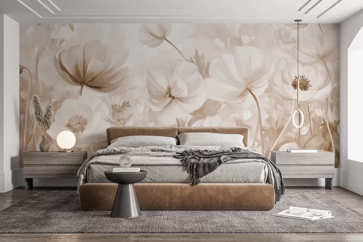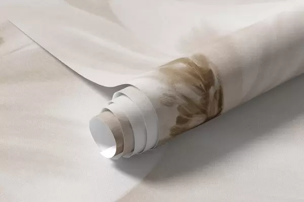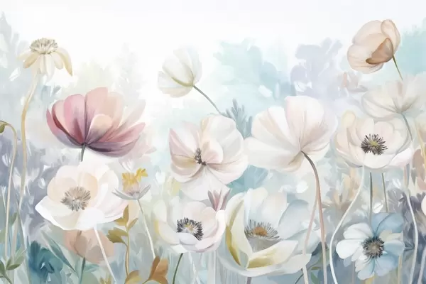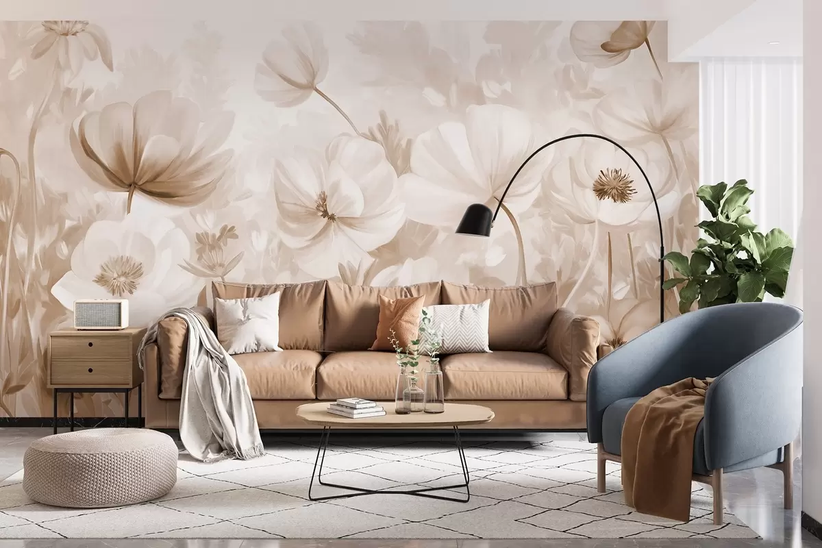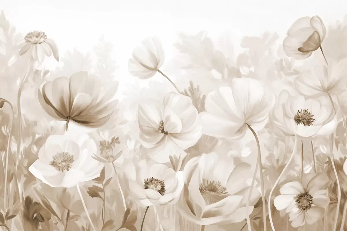Fototapet Et felt med beige blomster med delikate kronblade og bløde brune blade i en drømmende akvarelstil med struktur Nr. w09481v1