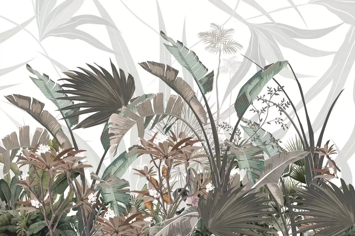 Fototapet Tropiske blade med blomster, palmer, plumeria-blomster, pastelfarver, hvid baggrund, jungle Nr. w09488