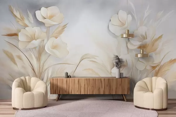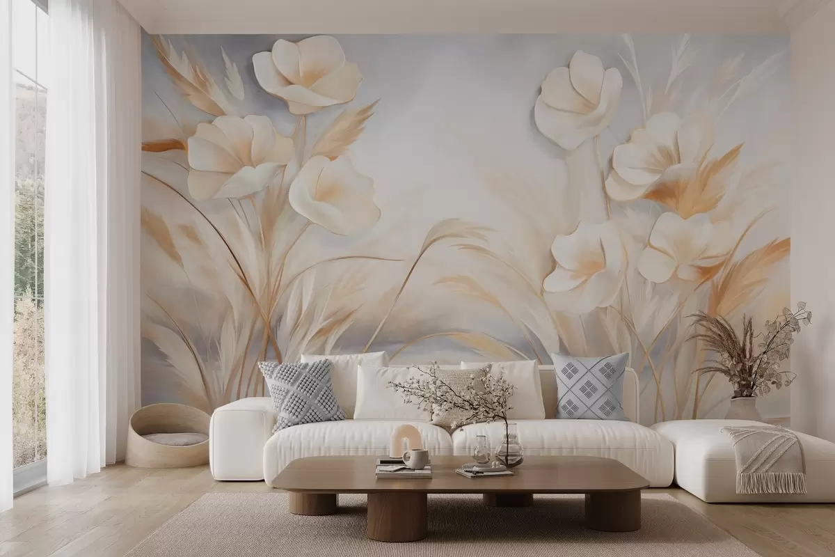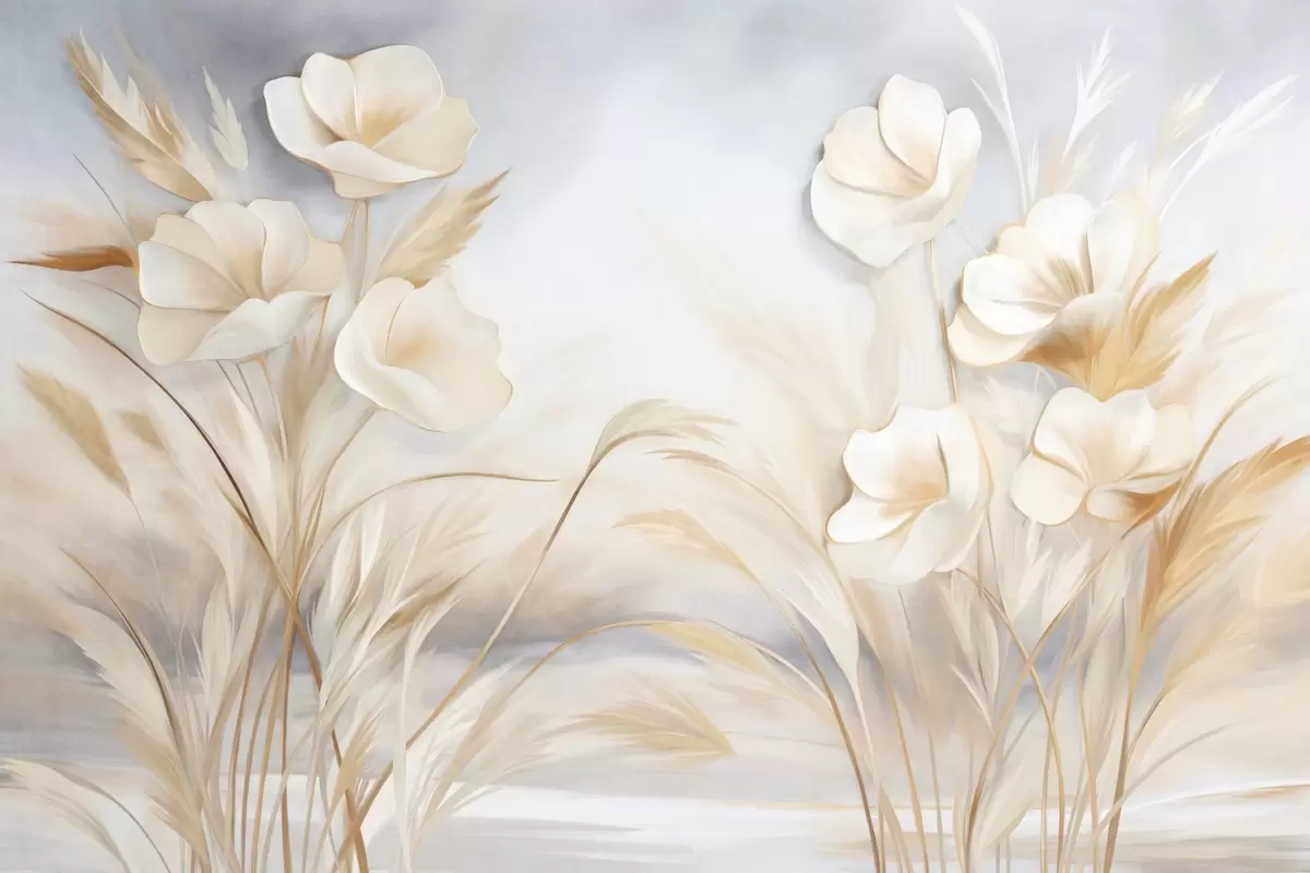 Fototapet Hvide blomster, beige siv og pampasgræs, struktureret, elegant, minimalistisk stil, abstrakt landskabsbaggrund Nr. w09490