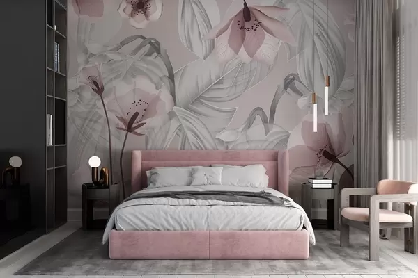 fototapeter Lyserøde blomster og grå blade, botanisk blomsterbaggrund, elegant design, bløde farver, lette, delikate detaljer w09497