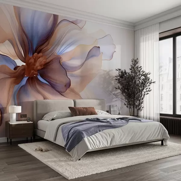 Fototapet Detaljeret stor blomst med hvid, blå og brun kronblade på hvid baggrund Nr. w09498