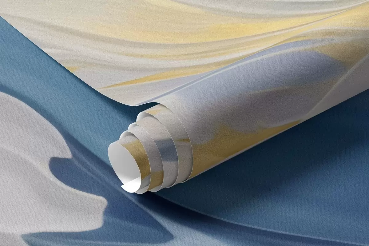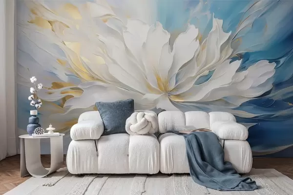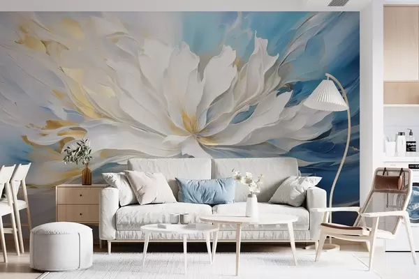 Fototapet Stor hvid pæon i oliemaleri-stil på en blå-gul baggrund Nr. w09511