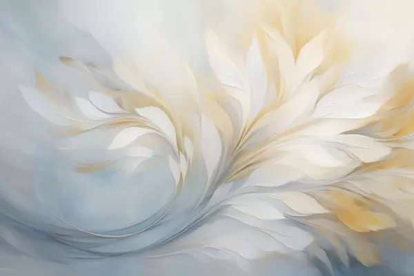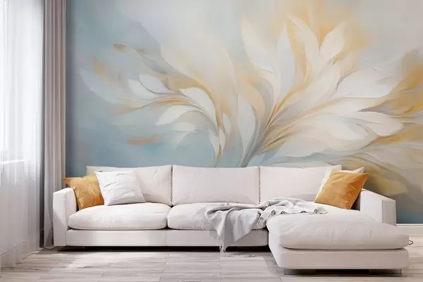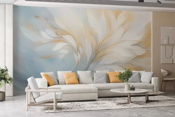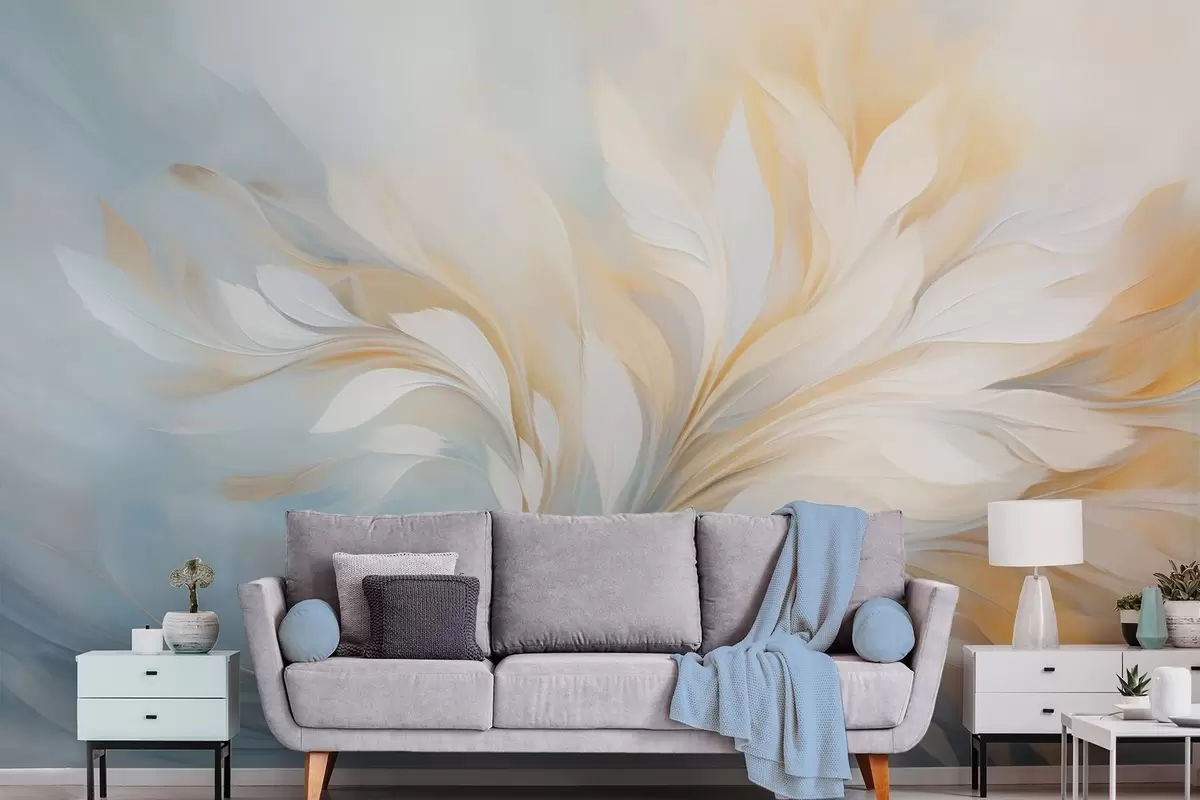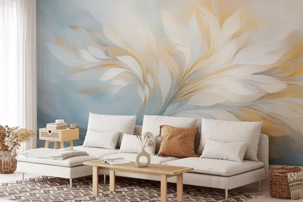 Fototapet Abstrakt komposition af glatte fjerlignende former i gule og blå nuancer Nr. w09525