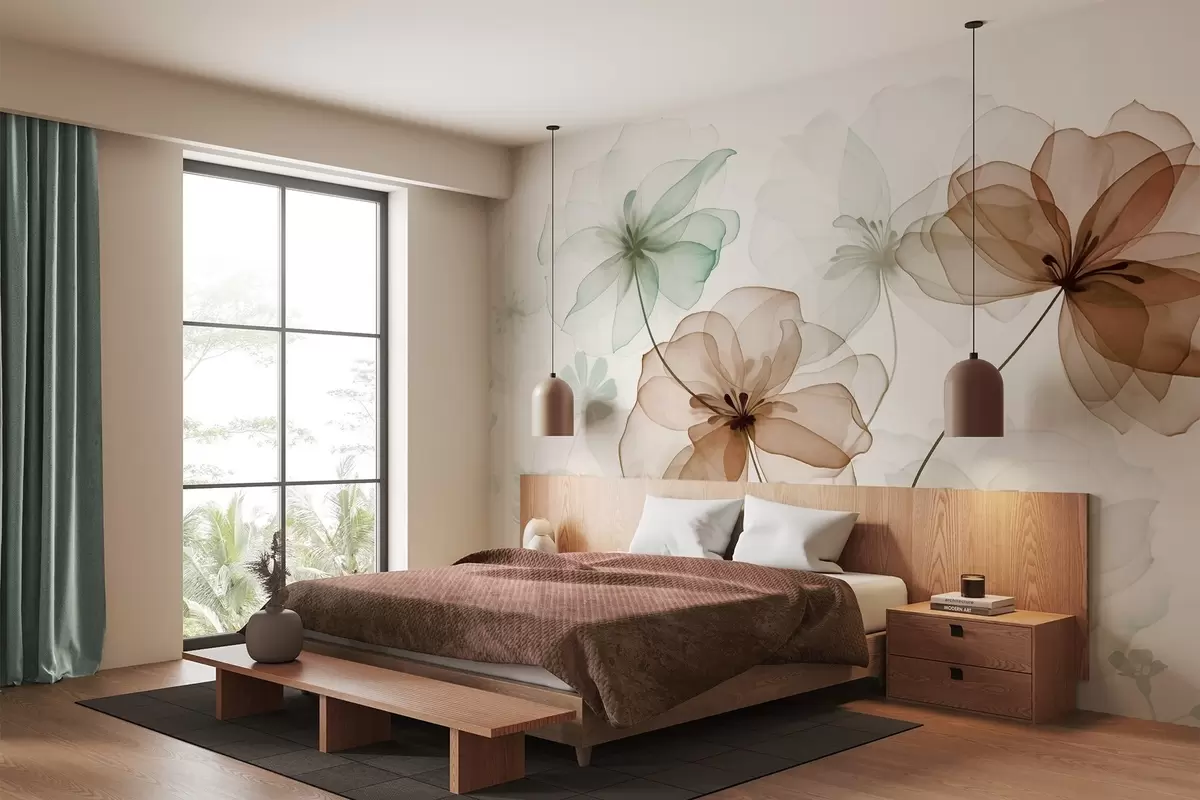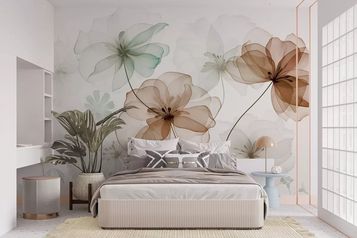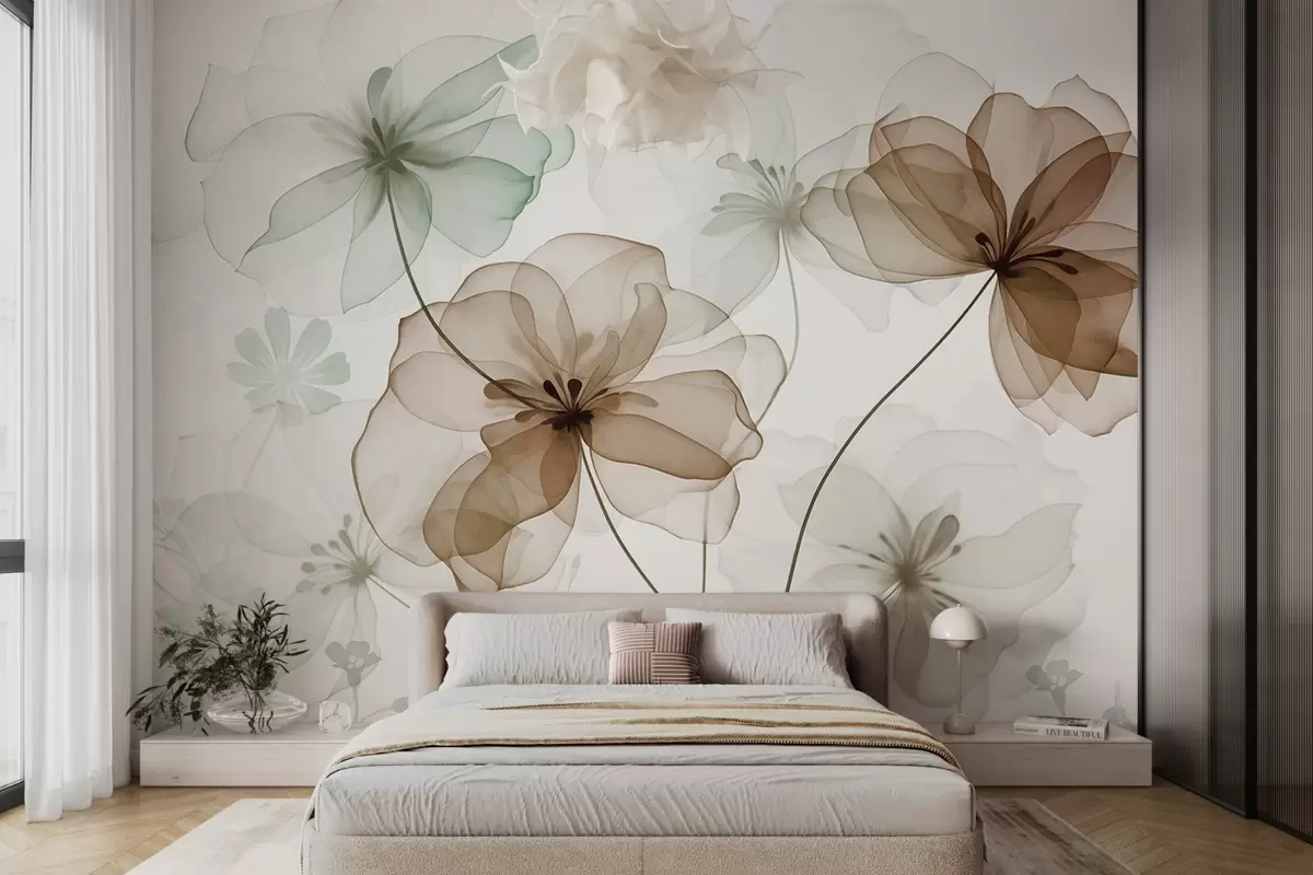 Fototapet Gennemsigtige blomster med brune og grønne kronblade, lange stængler, lys baggrund, bløde farver, blomstermønster med struktur Nr. w09529