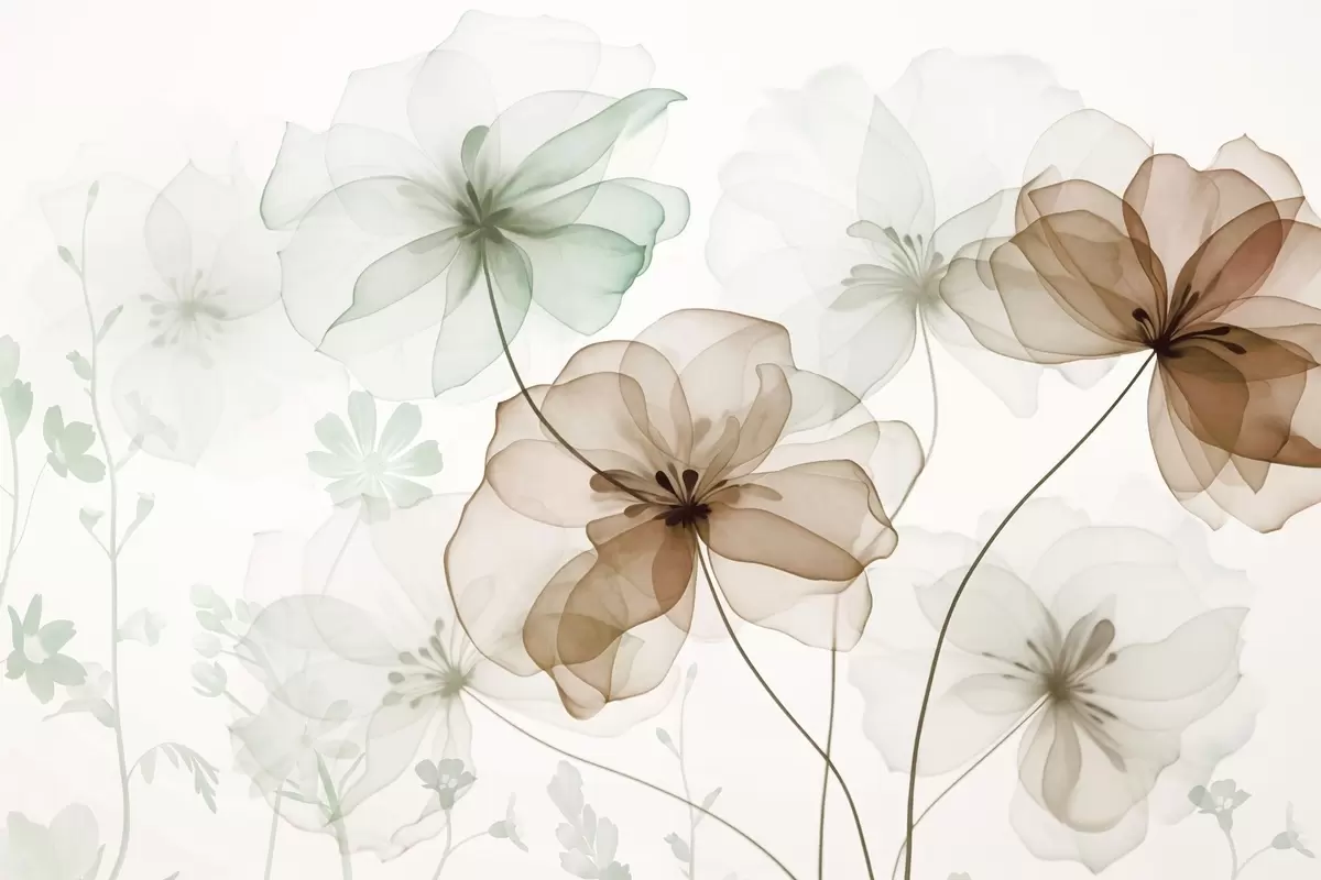 Fototapet Gennemsigtige blomster med brune og grønne kronblade, lange stængler, lys baggrund, bløde farver, blomstermønster med struktur Nr. w09529
