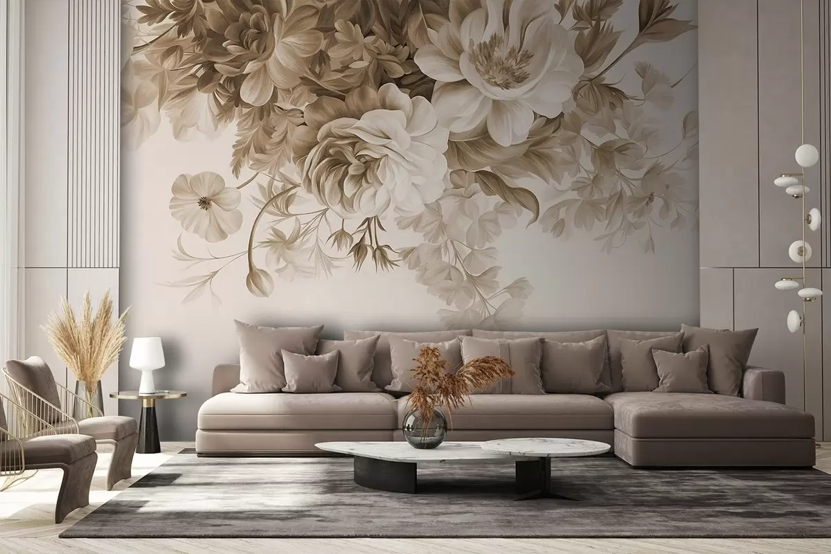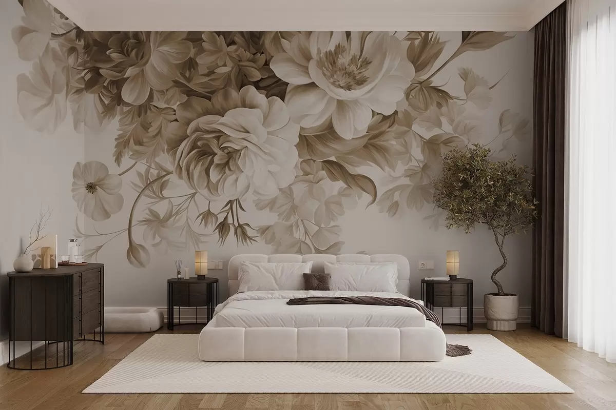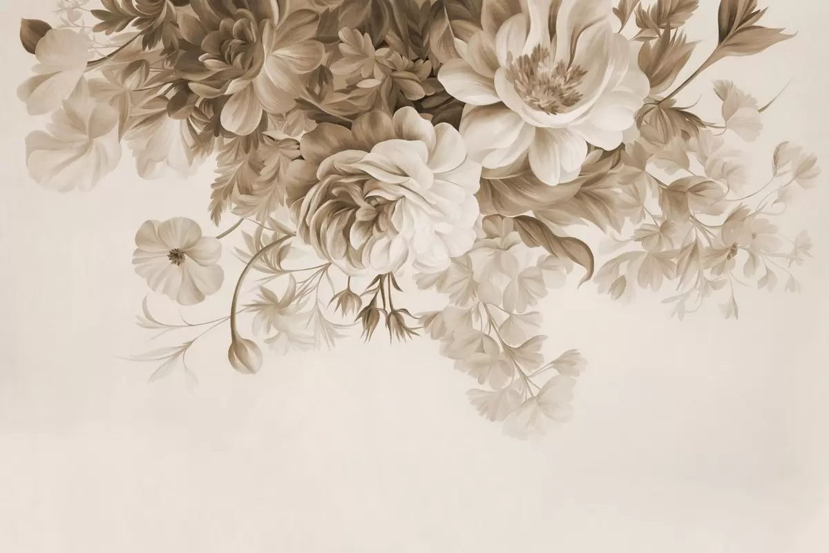 Fototapet Vintage blomsterarrangement med roser, pæoner og andre blomster med struktur og blade på en lys baggrund Nr. w09532v1