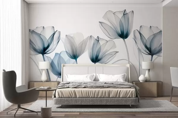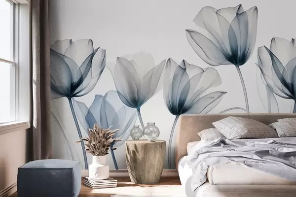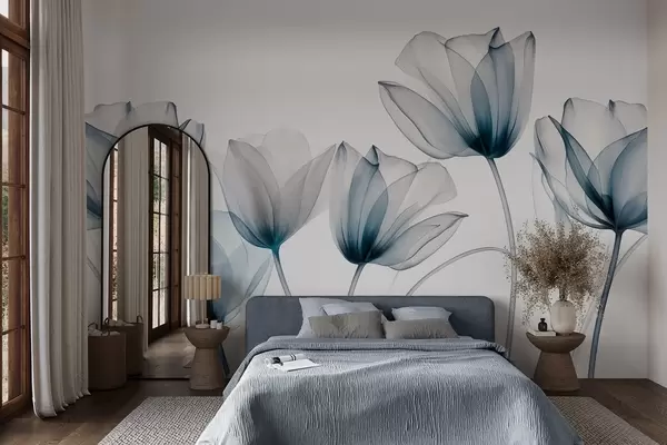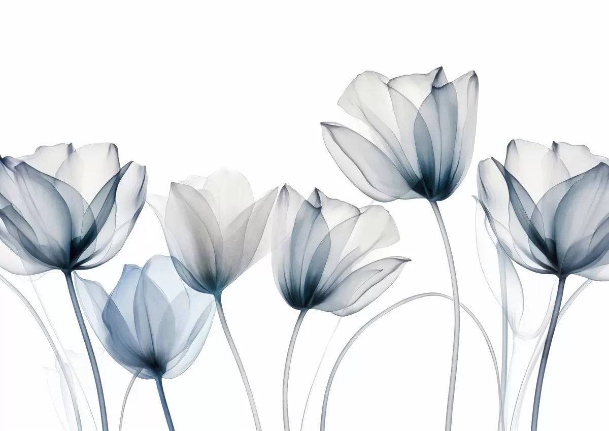 Fototapet Gennemsigtige blå og hvide tulipanblomster med lange stilke, mod lys baggrund, delikat og struktureret blomsterkunst Nr. w09538
