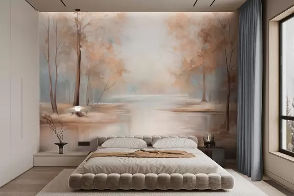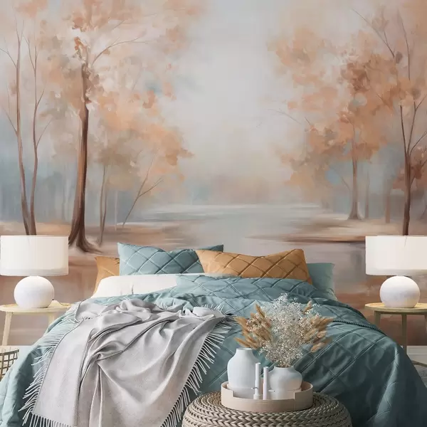 Fototapet Efterårslignende landskab med træer og en flod, bløde farver, lys og luftig atmosfære, fredelig og rolig scene Nr. w09541