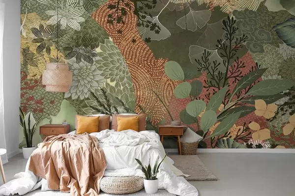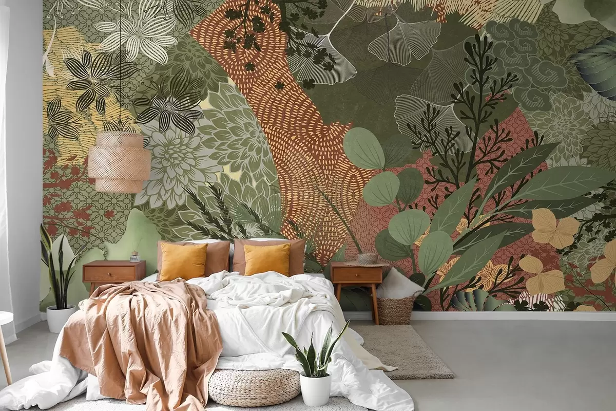 Fototapet Abstrakt tekstureret collage af botaniske elementer med blade, blomster og organiske teksturer i nuancer af grønt og brunt. Nr. w09545