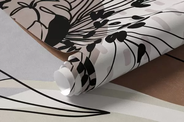 Fototapet Abstrakt blomsterprint med stregtegninger af blomster, blade og organiske former i dæmpede brune, beige og grå nuancer. Nr. w09548