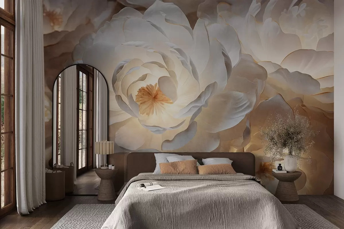 Fototapet Store, hvide fantasifulde pæonblomster med gule centre, blødt lys og delikate, teksturerede lagdelte kronblade. Nr. w09550