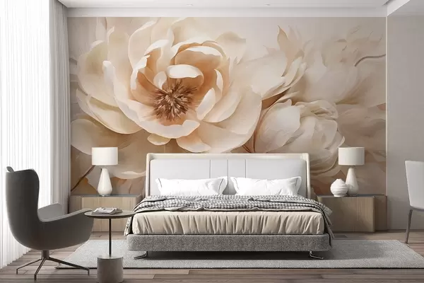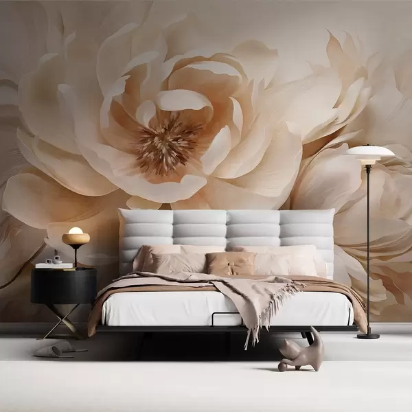 fototapeter Cremefarvede pæoner med brun midte og blade på en sløret, lys, abstrakt baggrund w09554