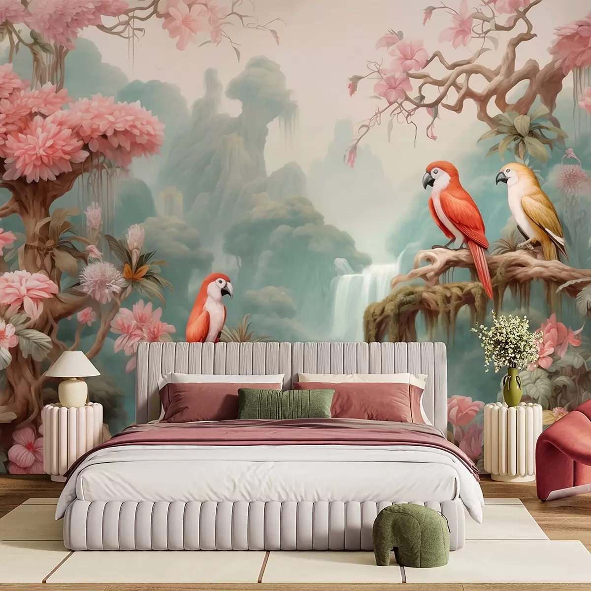 Fototapet En eventyrlig tropisk skov med papegøjer, blomstrende træer med lyserøde blomster og et vandfald Nr. w09580