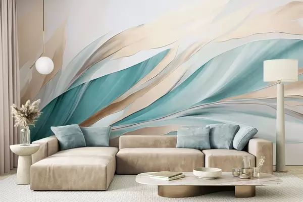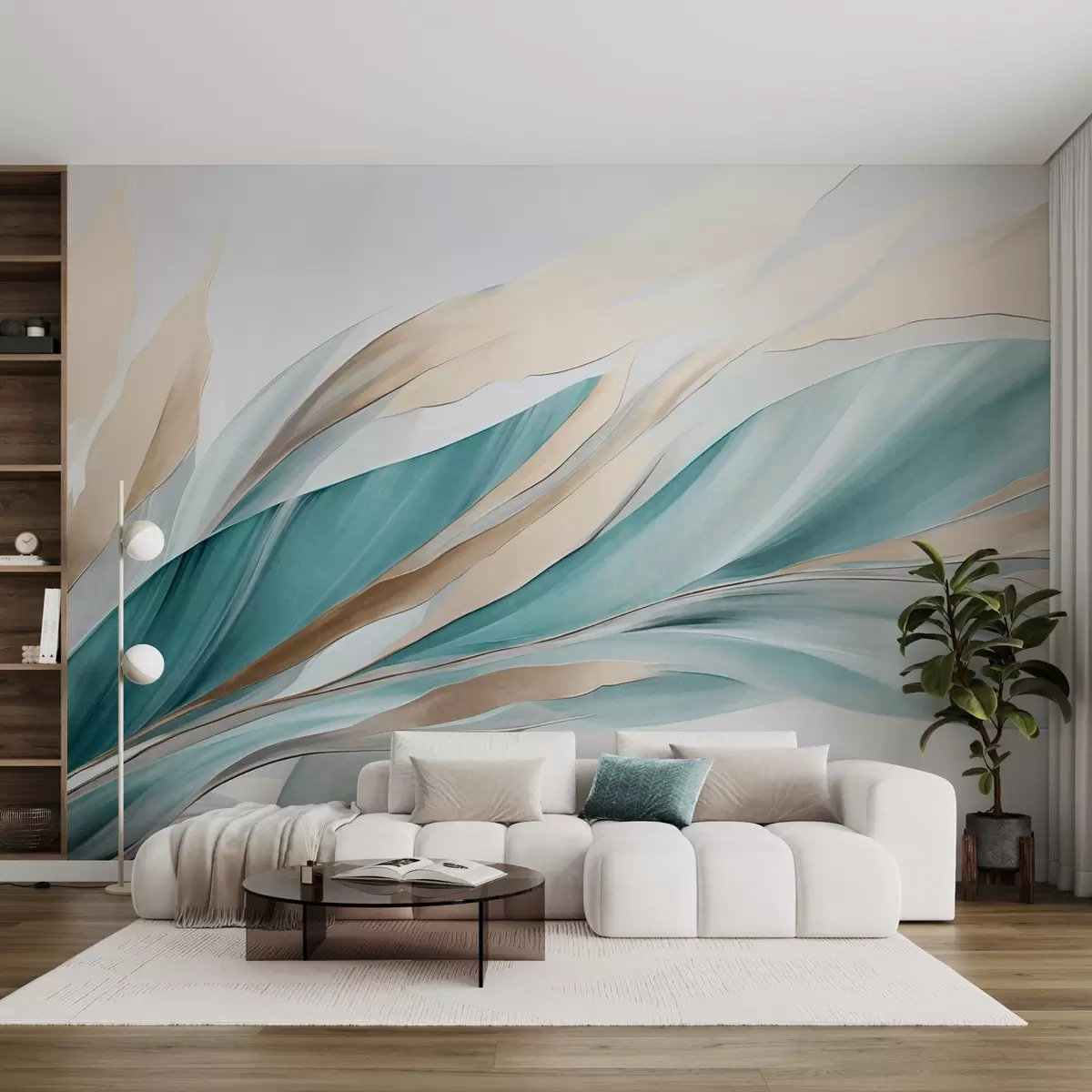 Fototapet Abstrakte flydende bølger i blågrøn og gul, med tynde former og linjer, på hvid baggrund, tekstureret kunst Nr. w09585