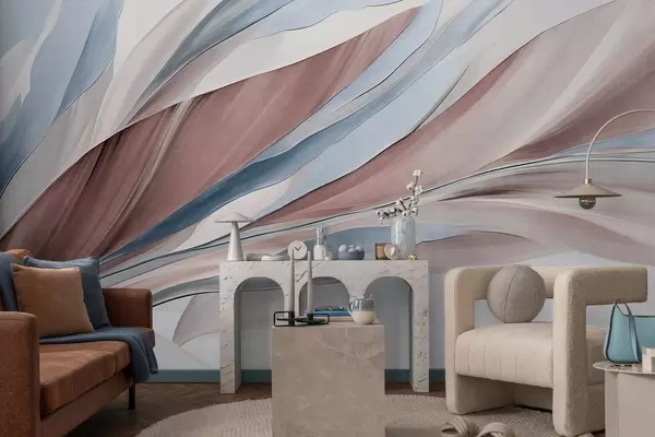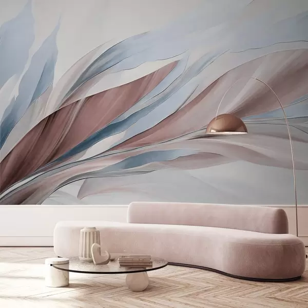 Fototapet Abstrakte flydende bølger i blå og brun, med tynde former og linjer, på en hvid baggrund, tekstureret kunst Nr. w09585v1
