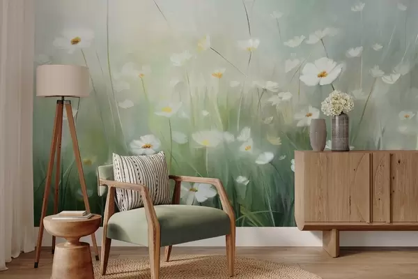 Fototapet Abstrakt felt med hvide tusindfryd, grønt græs og en blød, tåget baggrund i malerisk stil Nr. w09619