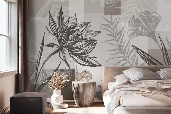 Fototapet Teksturerede stiliserede blomster og blade i brune og beige nuancer med geometrisk baggrund, stregtegning Nr. w09629