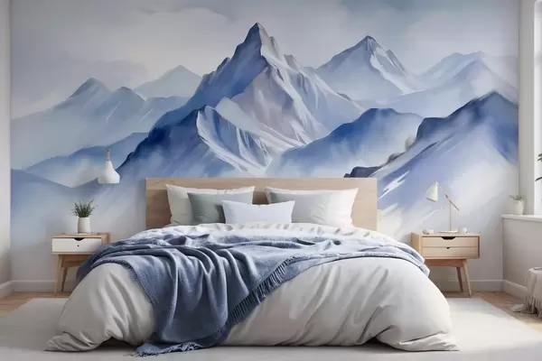 Fototapet Teksturerede snedækkede bjerge med en blød akvareleffekt og en palet af blå og hvid Nr. w09630