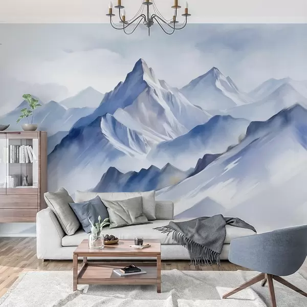 Fototapet Teksturerede snedækkede bjerge med en blød akvareleffekt og en palet af blå og hvid Nr. w09630