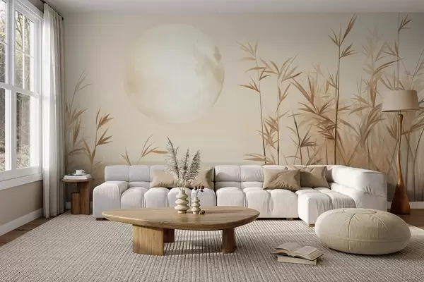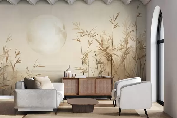 Fototapet Tekstureret landskab med høje siv, sø og bleg måne i en diset himmel Nr. w09631