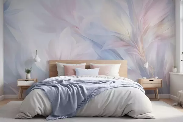 Fototapet Bløde, pastelfarvede blade og fjer i nuancer af lyserødt, blåt og gult, abstrakt og struktureret print Nr. w09634