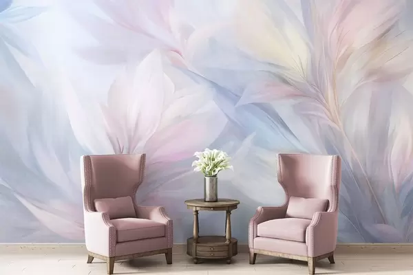 Fototapet Bløde, pastelfarvede blade og fjer i nuancer af lyserødt, blåt og gult, abstrakt og struktureret print Nr. w09634