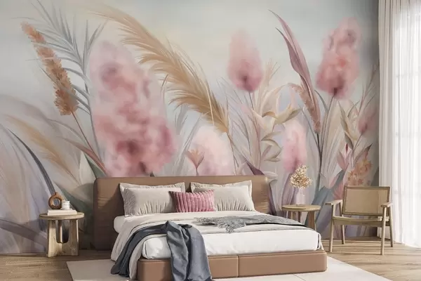 Fototapet Pink og beige pampasgræs og andre tørrede blomster med en blød, diset himmel i baggrunden Nr. w09635