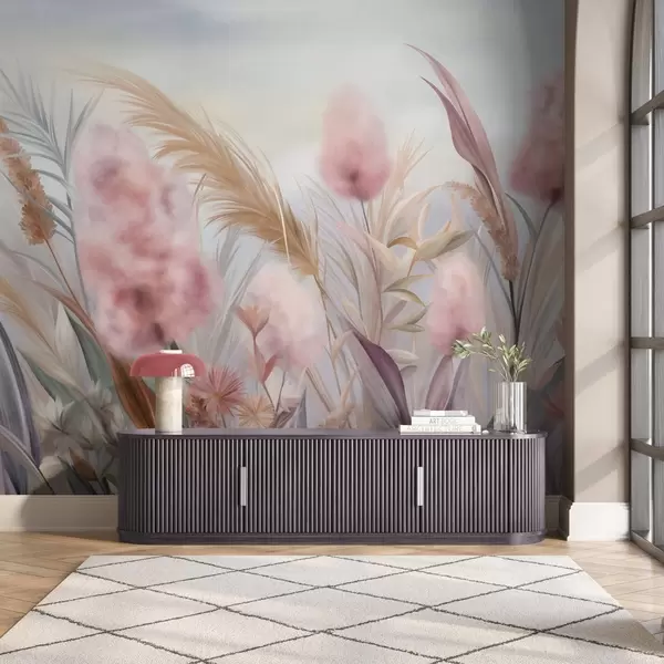 Fototapet Pink og beige pampasgræs og andre tørrede blomster med en blød, diset himmel i baggrunden Nr. w09635